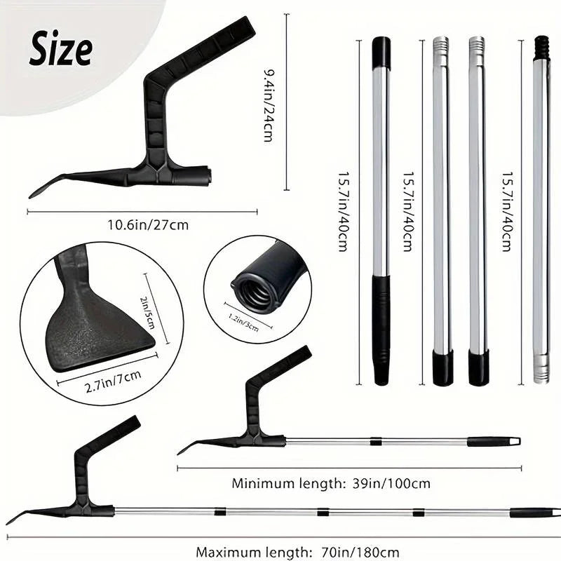 Deze handige tool is gemaakt om bij het verwijderen van bladeren/mos e.a in de dakgoot waarbij u links 180 cm bladeren naar u toe kan trekken alsook rechts 180 cm. Maw u wint hier enorm veel tijd en ook veel minder de ladder te verplaatsen, waarbij u ook veiliger kan werken door minder de ladder te gebruiken.