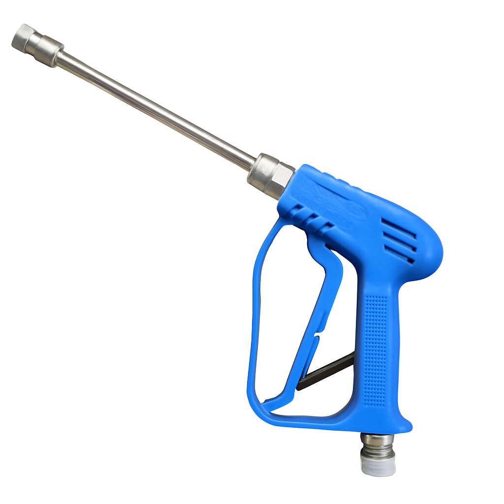 Hoogwaardig volledig RVS spuitpistool, uitgerust met een 40 cm RVS lans en twee roestvrijstalen slangtules van 8 mm en 13 mm. Zelfs het binnenwerk van het pistool is volledig vervaardigd uit roestvrij staal voor maximale duurzaamheid en corrosiebestendigheid.